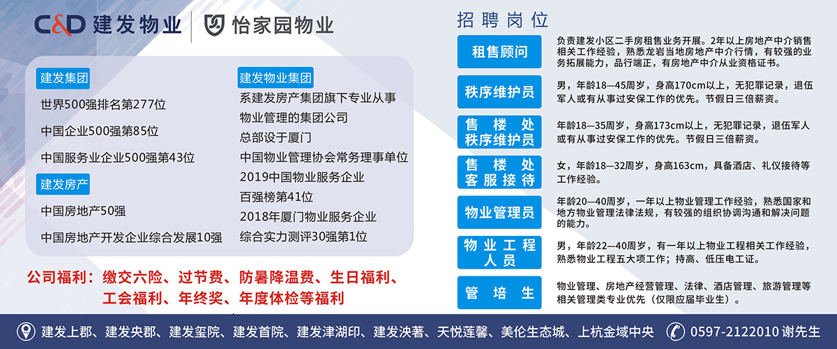 誠聘: 物業(yè)水電工:持高低壓電工證;維序員(保安):有保安證優(yōu)先,節(jié)假日三薪 3500-4500元,交六險、過節(jié)費、降溫費、生日福利、工會福利、年度體檢、年終獎等。