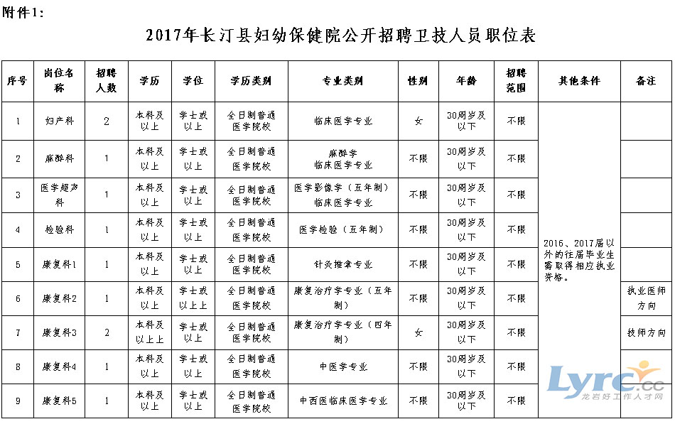 詳見(jiàn)《2017年長(zhǎng)汀縣婦幼保健院公開(kāi)招聘衛(wèi)技人員職位表》(附件1)。