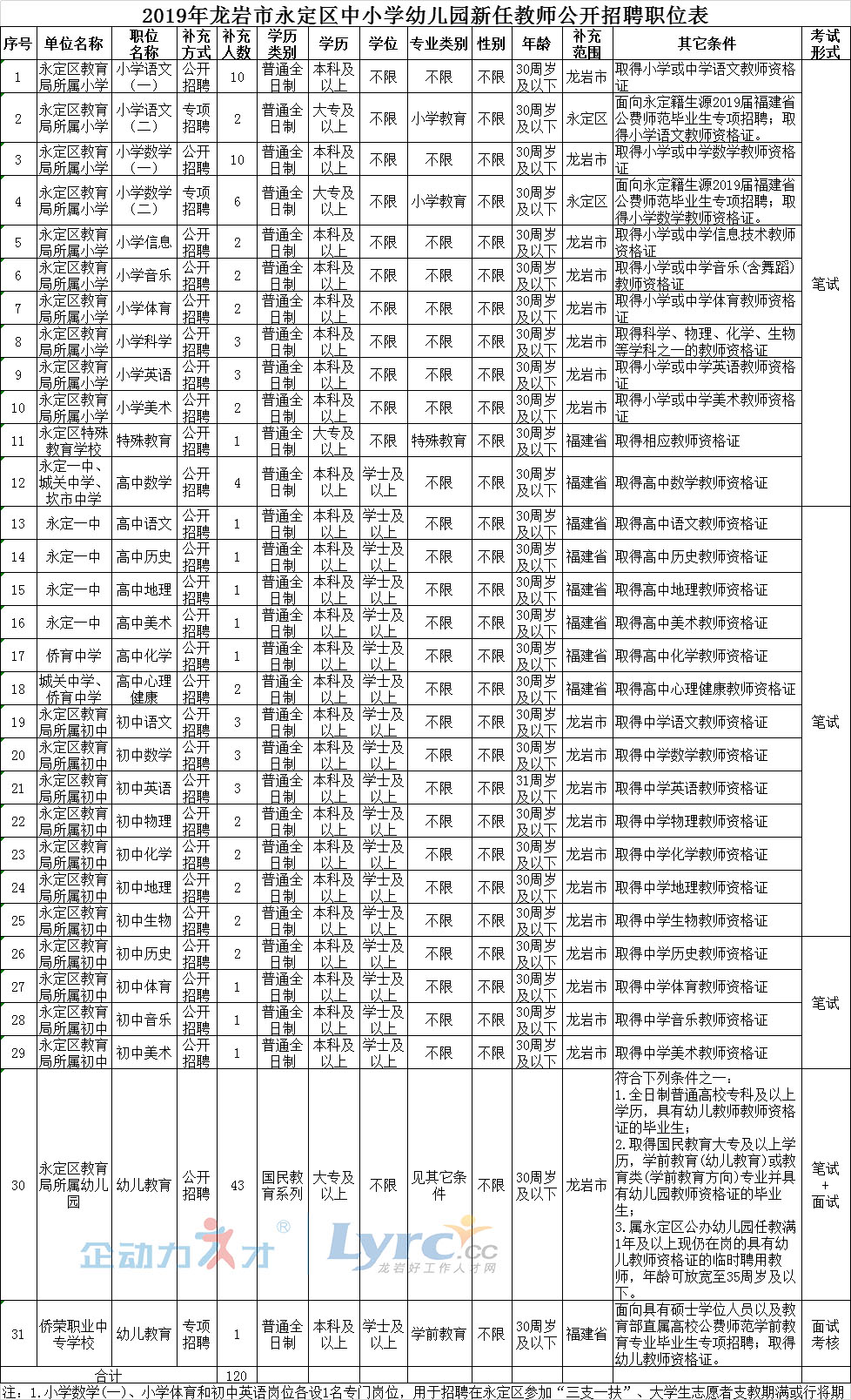 全區(qū)共計(jì)劃招聘120名,其中:小學(xué)42名,特殊教育1名,初中22名,高中11名,中職學(xué)校1名,幼兒園43名。具體招聘崗位、人數(shù)及資格條件等,詳見《2019年龍巖市永定區(qū)中小學(xué)幼兒園新任教師公開招聘職位表》(附件1),其中: