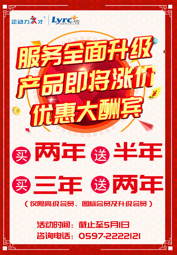 龍巖好工作人才網(wǎng)會(huì)員服務(wù)201951日起,服務(wù)全面升級(jí),收費(fèi)標(biāo)準(zhǔn)變更;通過(guò)此次服務(wù)的升級(jí),更好的提升品牌,挖掘人才,提升招聘效能。