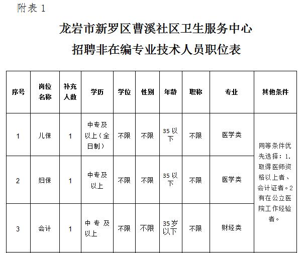 附表1:龍巖市新羅區(qū)曹溪社區(qū)衛(wèi)生服務(wù)中心招聘非在編專業(yè)技術(shù)人員職位表(點(diǎn)擊下載)