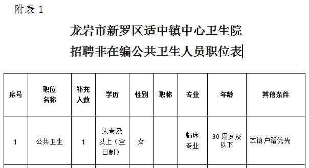 附表1:龍巖市新羅區(qū)適中鎮(zhèn)中心衛(wèi)生院招聘非在編公共衛(wèi)生人員職位表(點擊下載)