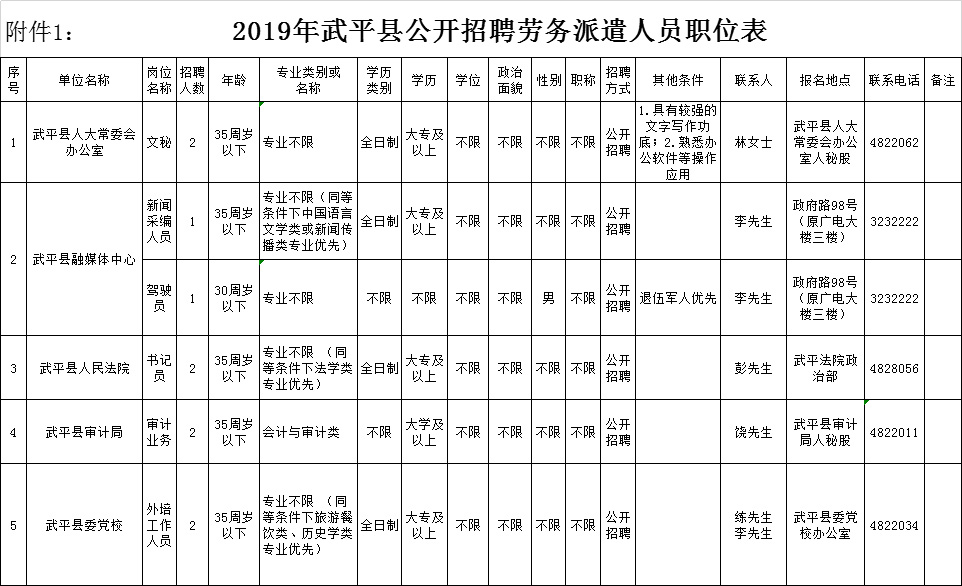 • 2019年武平縣公開招聘勞務(wù)派遣人員通告