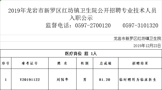 您當(dāng)前的位置:首頁(yè) > 新羅區(qū)國(guó)有企事業(yè) > 【入職公示】2019年龍巖市新羅區(qū)紅坊鎮(zhèn)衛(wèi)生院公開招聘專業(yè)技術(shù)人員入職公示