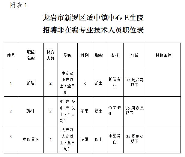 附件1:龍巖市新羅區(qū)適中鎮(zhèn)中心衛(wèi)生院招聘非在編專業(yè)技術(shù)人員職位表