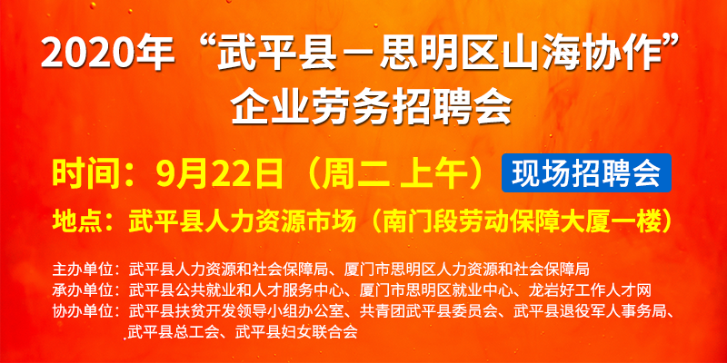 • 【9月22招聘會】2020年“武平縣-思明區(qū)山海協(xié)作”企業(yè)勞務(wù)招聘會