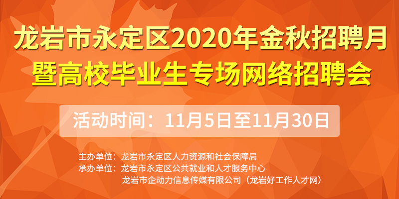 • 龍巖市永定區(qū)2020年金秋招聘月暨高校畢業(yè)生專(zhuān)場(chǎng)網(wǎng)絡(luò)招聘會(huì)