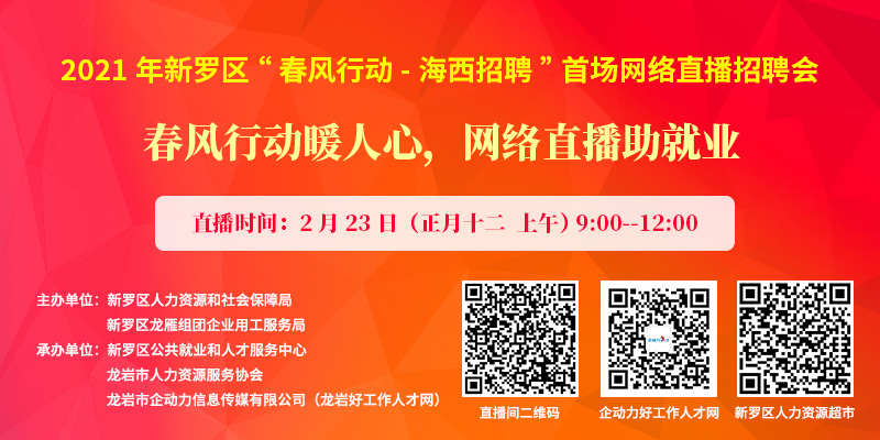 您當(dāng)前的位置:首頁(yè) > 新聞動(dòng)態(tài) > 【直播回放】2021年新羅區(qū)“春風(fēng)行動(dòng)—海西招聘”首場(chǎng)網(wǎng)絡(luò)直播招聘會(huì)公告