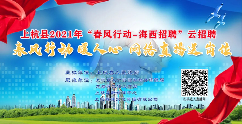 •    為扎實做好“六穩(wěn)”工作,落實“六保”任務,全面做好新冠肺炎疫情防控工作,按照“不聚集不扎堆”的防控要求,由上杭縣人民政府主辦,上杭縣人力資源和社會保障局、龍巖好工作人才網(wǎng)、上杭縣融媒體中心、上杭融媒文化傳播有限公司承辦的“春風行動——海西招聘”云招聘直播帶崗活動將于2月19日(正月初八)上午9:00舉行。