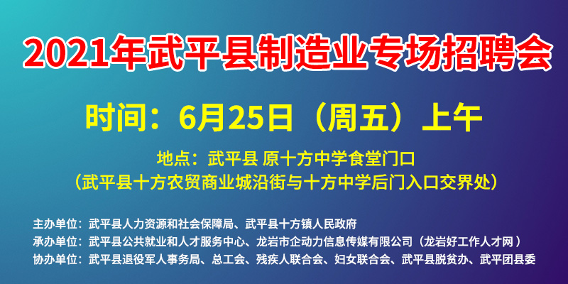 • 【6月25日武平招聘會】2021年武平縣制造業(yè)專場招聘會