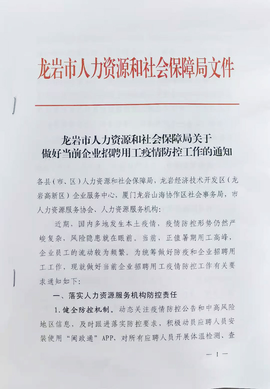 您當(dāng)前的位置:首頁 > 新聞動態(tài) > 龍巖市人力資源和社會保障局關(guān)于做好當(dāng)前企業(yè)招聘用工疫情防控工作的通知