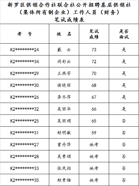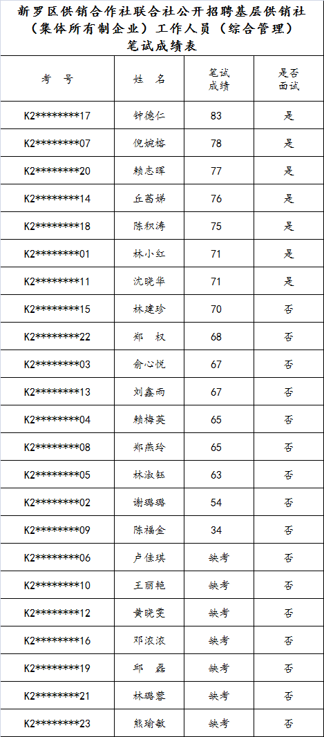您當(dāng)前的位置:首頁 > 新聞動態(tài) > 【筆試成績公示】新羅區(qū)供銷合作社聯(lián)合社關(guān)于公開招聘基層供銷社(集體所有制企業(yè))工作人員的筆試成績公示