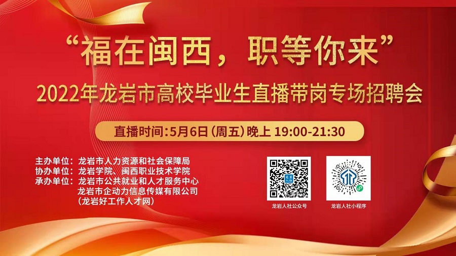 • 【直播回放】歡迎參加“福在閩西,職等你來”2022年龍巖市高校畢業(yè)生直播帶崗專場(chǎng)招聘會(huì)