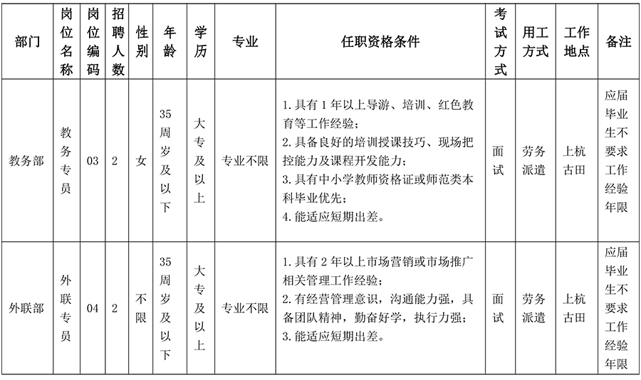 •   龍巖市圣地古田文化傳播有限公司是上杭縣屬一級國企上杭古田建設發(fā)展有限公司所屬全資子公司,是龍巖市人民政府批準同意設立的集革命傳統(tǒng)教育、理想信念教育及素質(zhì)拓展培訓服務為一體的專業(yè)培訓機構(gòu)。龍巖市圣地古田文化傳播有限公司依托古田及周邊地區(qū)的革命歷史資源和教學資源的優(yōu)勢,緊緊圍繞“不忘初心,牢記使命”這個主題,以堅定理想信念、加強黨性修養(yǎng)、錘煉優(yōu)秀作風為目的,創(chuàng)造新的教學模式,形成一套完備豐富的教學模式體系。現(xiàn)因各公司業(yè)務拓展需要,決定面向社會公開招聘部分崗位工作人員,F(xiàn)將有關(guān)招聘事項公告如下: