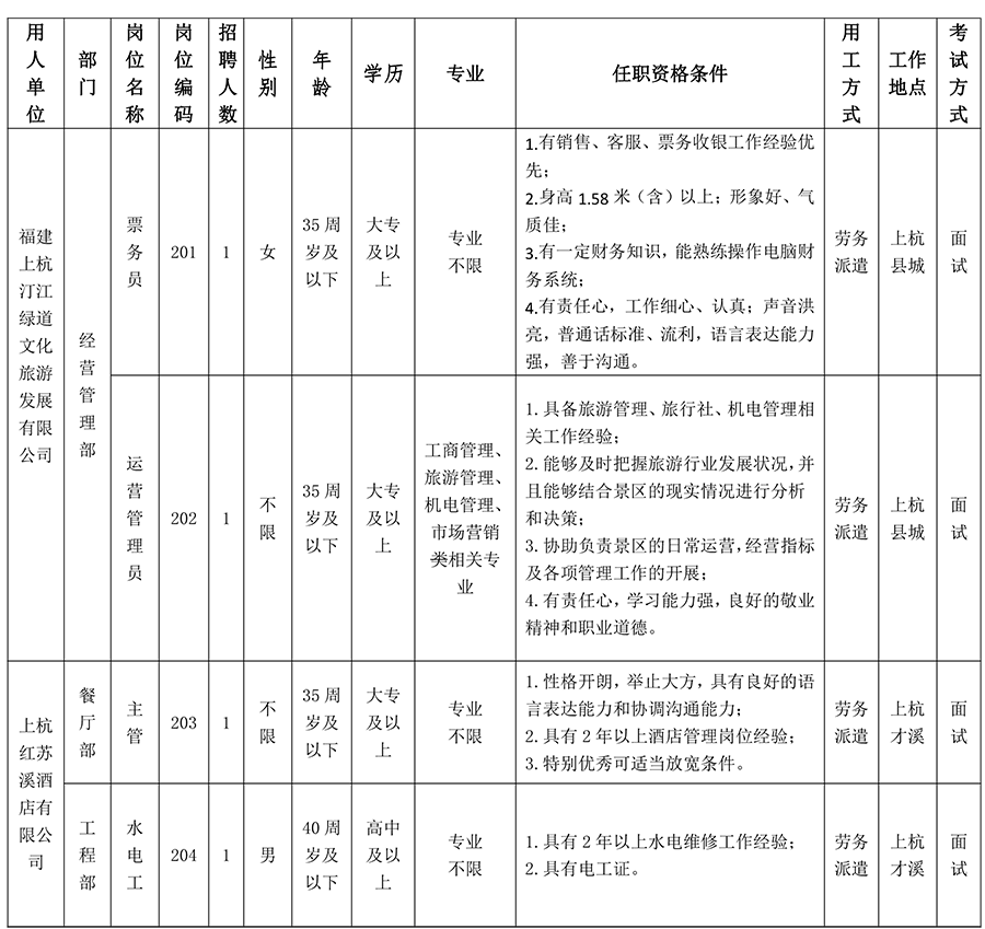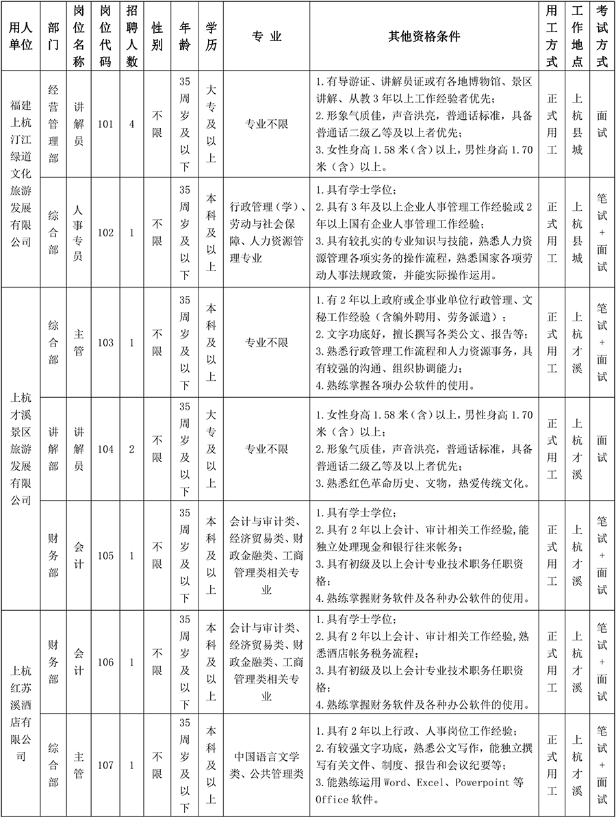 • 【招聘15名】上杭縣文化旅游發(fā)展有限公司(古田建發(fā)公司)關(guān)于公開招聘所屬企業(yè)工作人員的公告