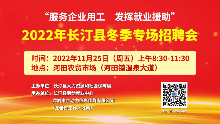 • 【11月25日長(zhǎng)汀招聘會(huì)】2022年長(zhǎng)汀縣“服務(wù)企業(yè)用工 發(fā)揮就業(yè)援助” 冬季專場(chǎng)招聘會(huì)