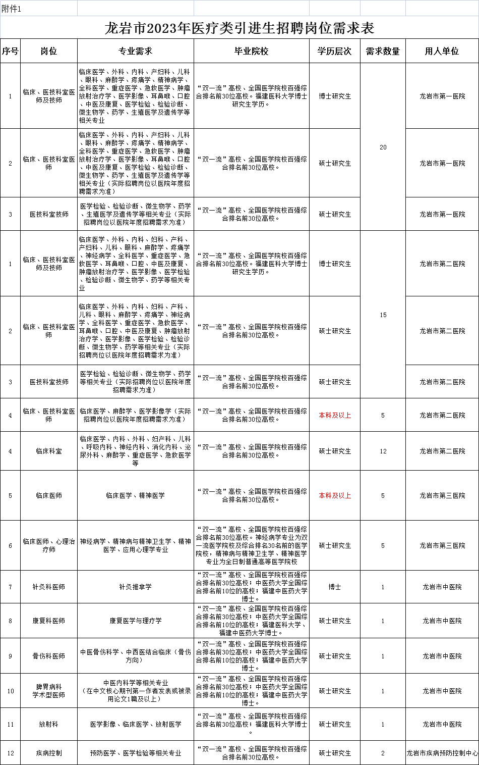 1、龍巖市2023年醫(yī)療類引進生招聘崗位需求表