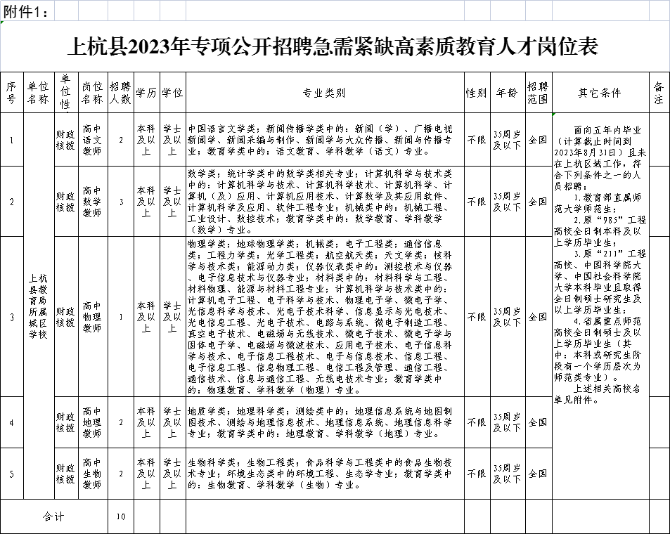 本次專項(xiàng)招聘人員為事業(yè)單位編制內(nèi)工作人員,招聘崗位5個(gè),計(jì)劃招聘人數(shù)10人。具體招聘崗位詳見《上杭縣2023年專項(xiàng)公開招聘急需緊缺高素質(zhì)教育人才崗位表》(附件1)。