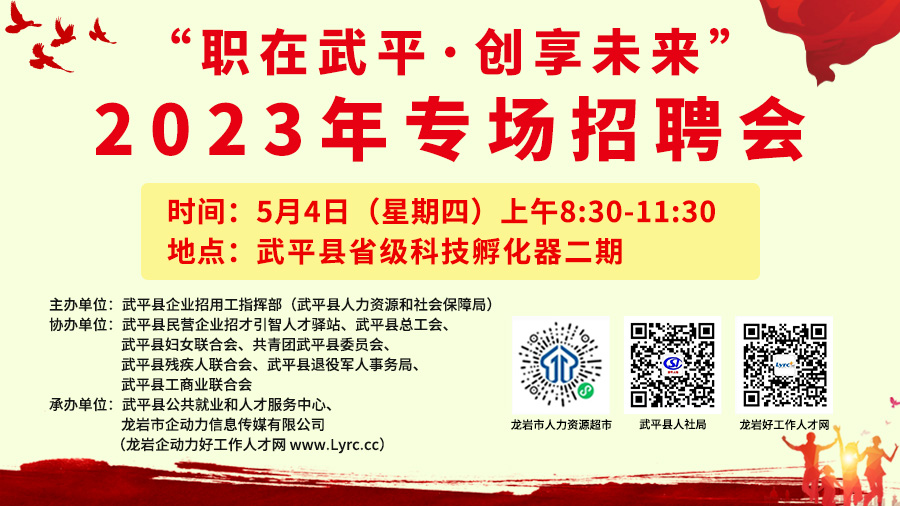 • 【5月4日武平】2023年“職在武平·創(chuàng)享未來(lái)”專場(chǎng)招聘會(huì)