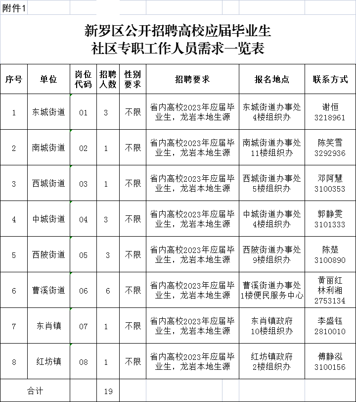 本次公開招聘高校應(yīng)屆畢業(yè)生社區(qū)專職工作人員共 19 名。具體招聘崗位詳見附件1。