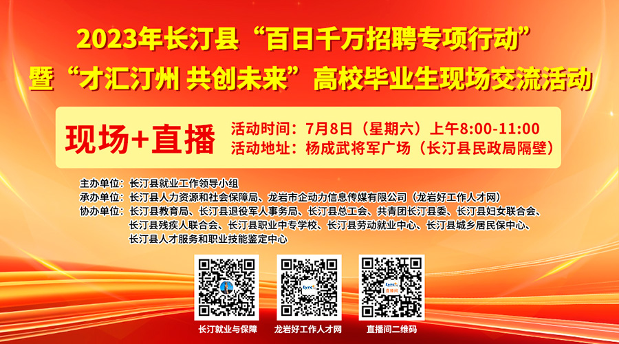 您當(dāng)前的位置:首頁(yè) > 新聞動(dòng)態(tài) > 關(guān)于開展2023年長(zhǎng)汀縣“百日千萬(wàn)招聘專項(xiàng)行動(dòng)”暨“才匯汀州 共創(chuàng)未來”高校畢業(yè)生現(xiàn)場(chǎng)交流活動(dòng)的通知