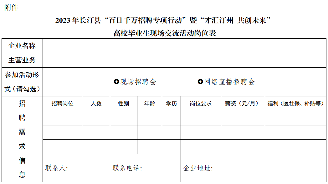 4.于2023年7月5日18時(shí)前填寫《2023年長(zhǎng)汀縣“百日千萬(wàn)招聘專項(xiàng)行動(dòng)”暨“才匯汀州 共創(chuàng)未來”高校畢業(yè)生現(xiàn)場(chǎng)交流活動(dòng)崗位表》(見附件),以電子郵件形式發(fā)送至郵箱:yinrendaren@163.com。