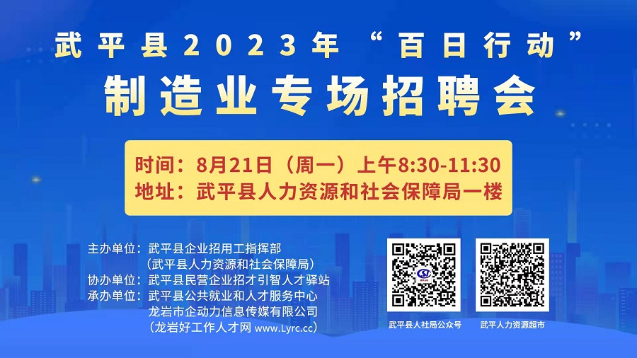 • 【8月21日】武平縣2023年“百日行動”制造業(yè)專場招聘會公告