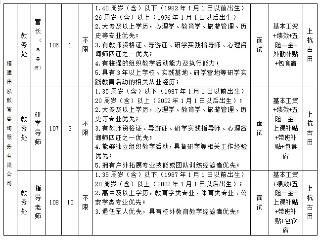 •   根據(jù)業(yè)務(wù)開展的需要,經(jīng)古田研學(xué)營地教學(xué)執(zhí)行單位福建偉泓教育咨詢服務(wù)有限公司決定,對2023年5月古田研學(xué)營地公開招聘的空缺崗位進(jìn)行補(bǔ)充招聘,現(xiàn)將有關(guān)事項公告如下: