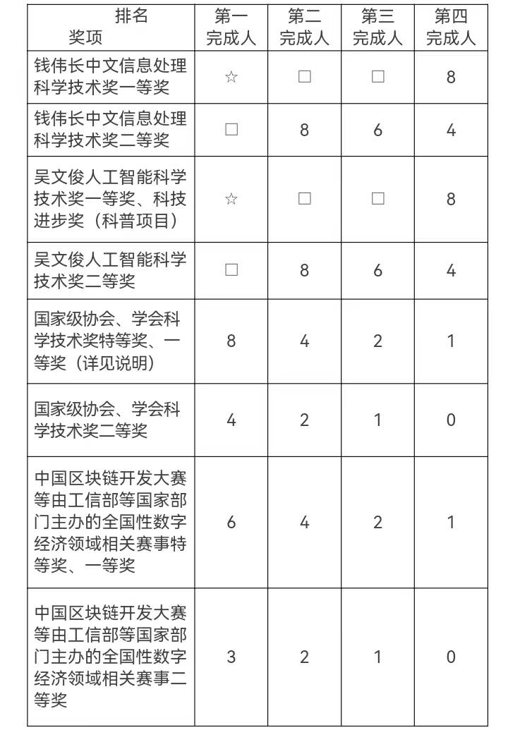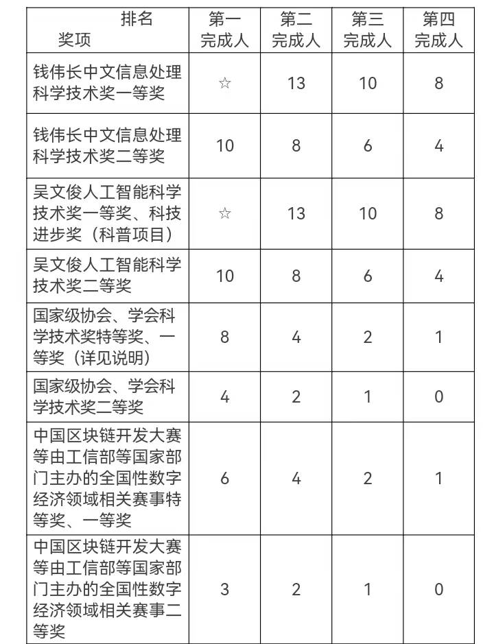 3.近10年內(nèi)所承擔科研項目獲得以下獎項,并按下列計算標準累計所得分值在15分以上的人才。如同一個項目獲多個獎項,只按其最高分值計分一次,不重復計分。“☆”對應獎項直接入選A類人才。