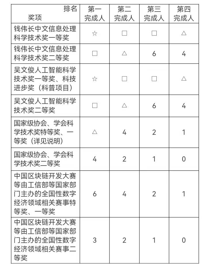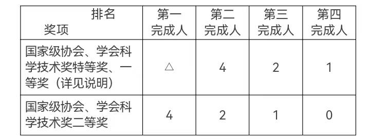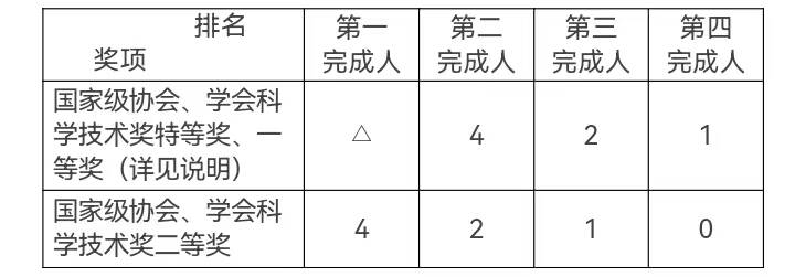 3.近10年內(nèi)所承擔科研項目曾獲得以下獎項,并按下列計算標準累計所得分值在8分以上的人才。如同一個項目獲多個獎項,只按其最高分值計分一次,不重復計分。“☆”對應獎項直接入選A類人才;“□”對應獎項直接入選B類人才;“△”對應獎項直接入選C類人才。