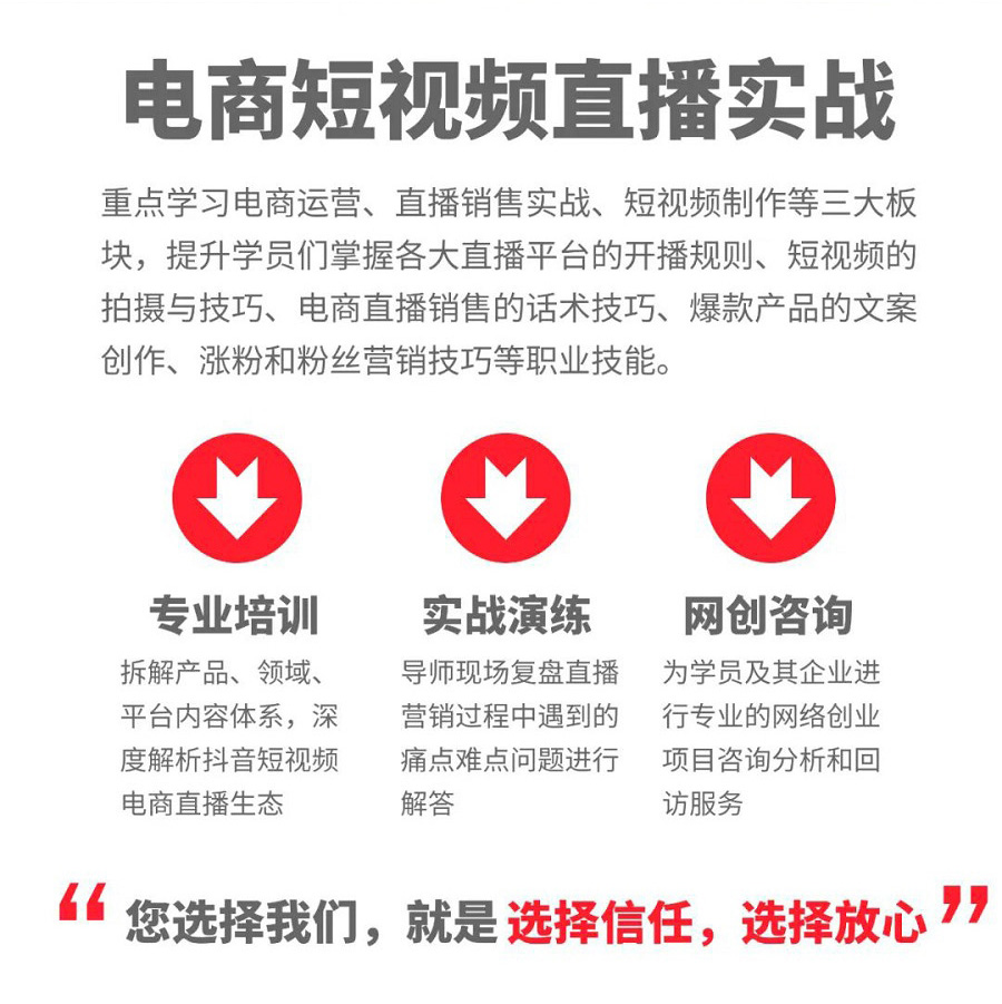 課程內(nèi)容:重點(diǎn)學(xué)習(xí)電商運(yùn)營、直播銷售實(shí)戰(zhàn)、短視頻制作等三大板塊,提升學(xué)員們掌握各大直播平臺(tái)的開播規(guī)則、短視頻的拍攝與技巧、電商直播銷售的話術(shù)技巧、爆款產(chǎn)品的文案創(chuàng)作、漲粉和粉絲營銷技巧等職業(yè)技能。
