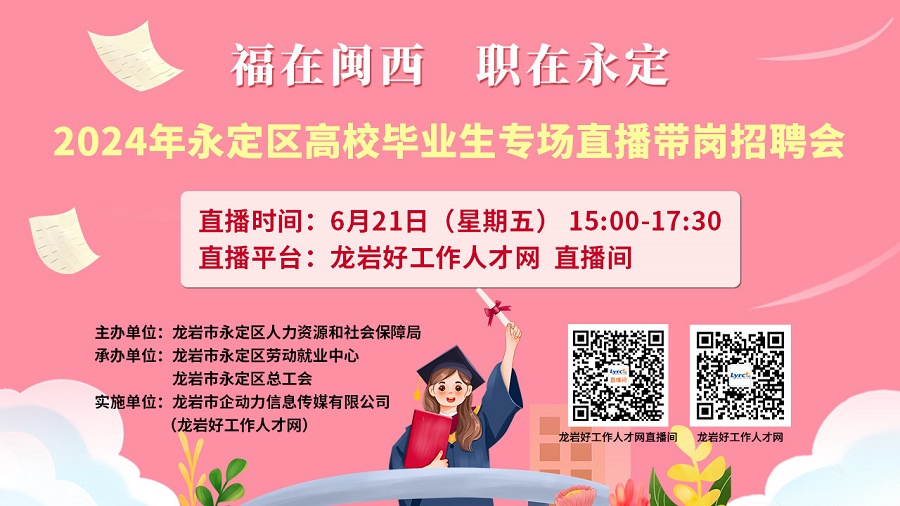 •   為深入貫徹黨的二十大精神,落實(shí)黨中央、國務(wù)院和省委、省政府關(guān)于做好高校畢業(yè)生就業(yè)工作部署,全方位推動精準(zhǔn)就業(yè)服務(wù),建立企業(yè)與求職者之間的供需對接平臺,有效促進(jìn)高校畢業(yè)生等青年群體就業(yè)創(chuàng)業(yè)工作,滿足企業(yè)用工需求,龍巖市永定區(qū)人力資源和社會保障局現(xiàn)決定舉辦“福在閩西 職在永定”2024年永定區(qū)高校畢業(yè)生專場直播帶崗招聘會。