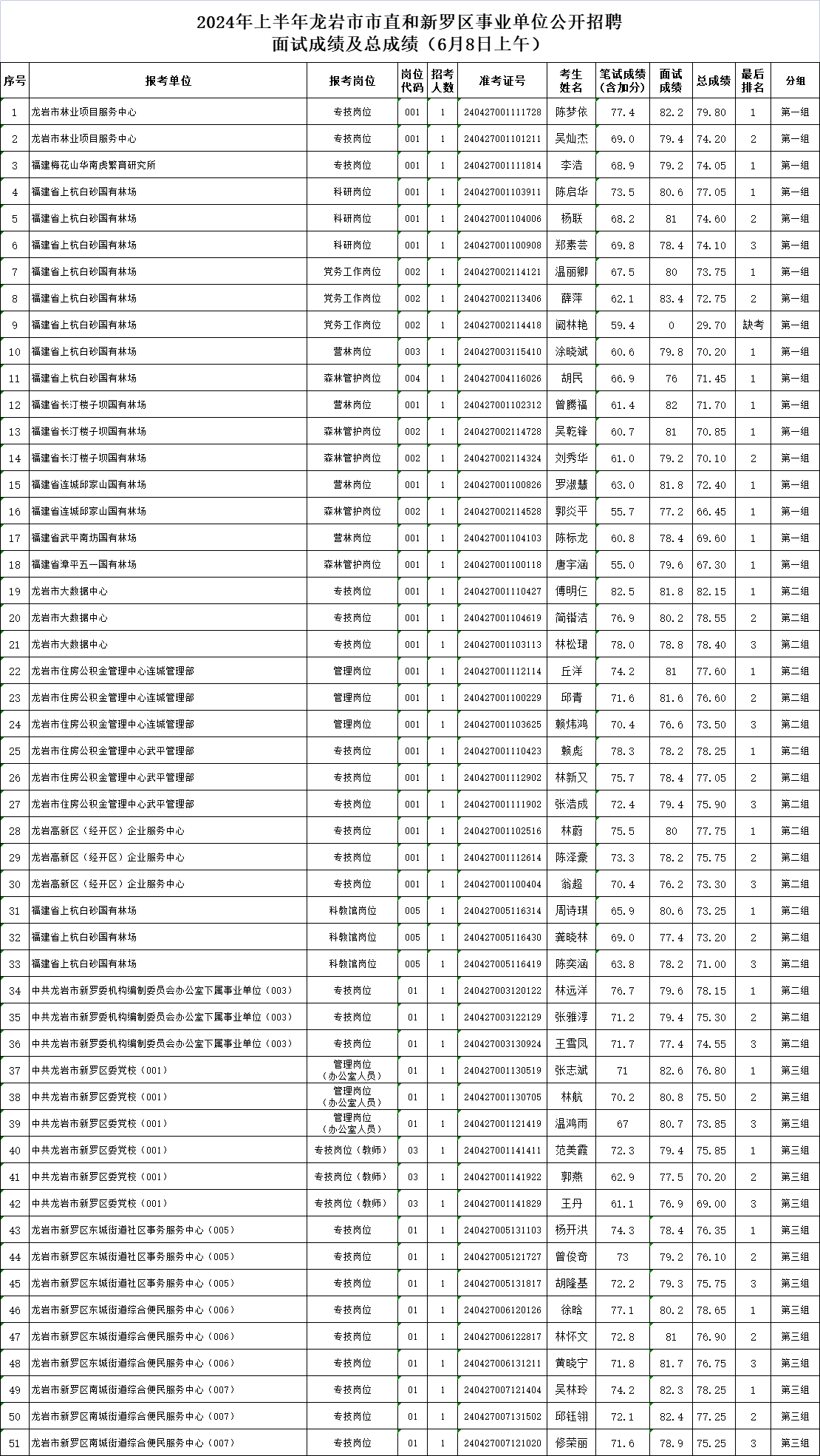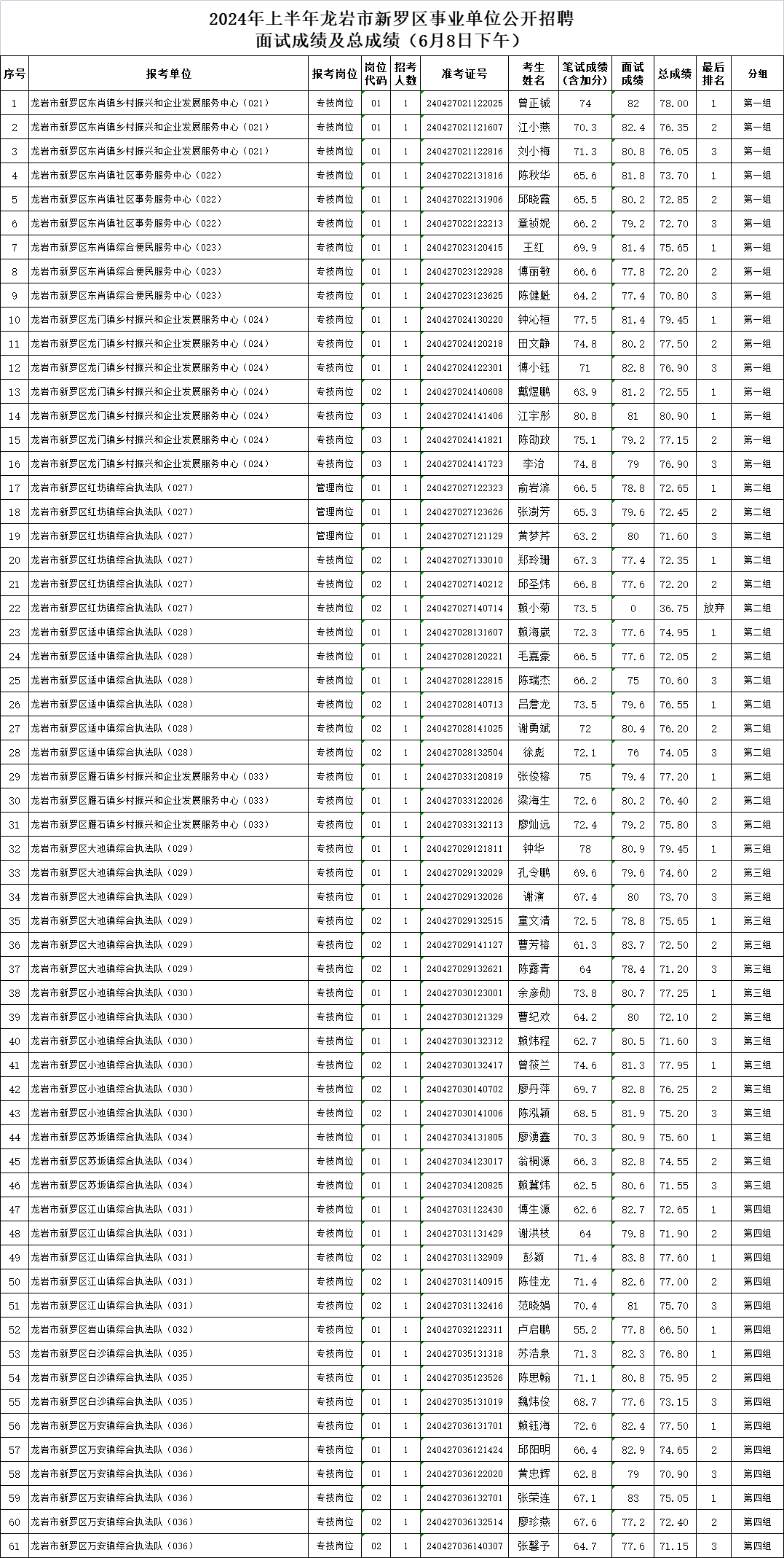 您當(dāng)前的位置:首頁 > 新聞動態(tài) > 2024年上半年龍巖市市直和新羅區(qū)事業(yè)單位公開招聘面試成績及總成績公布(6月8日)