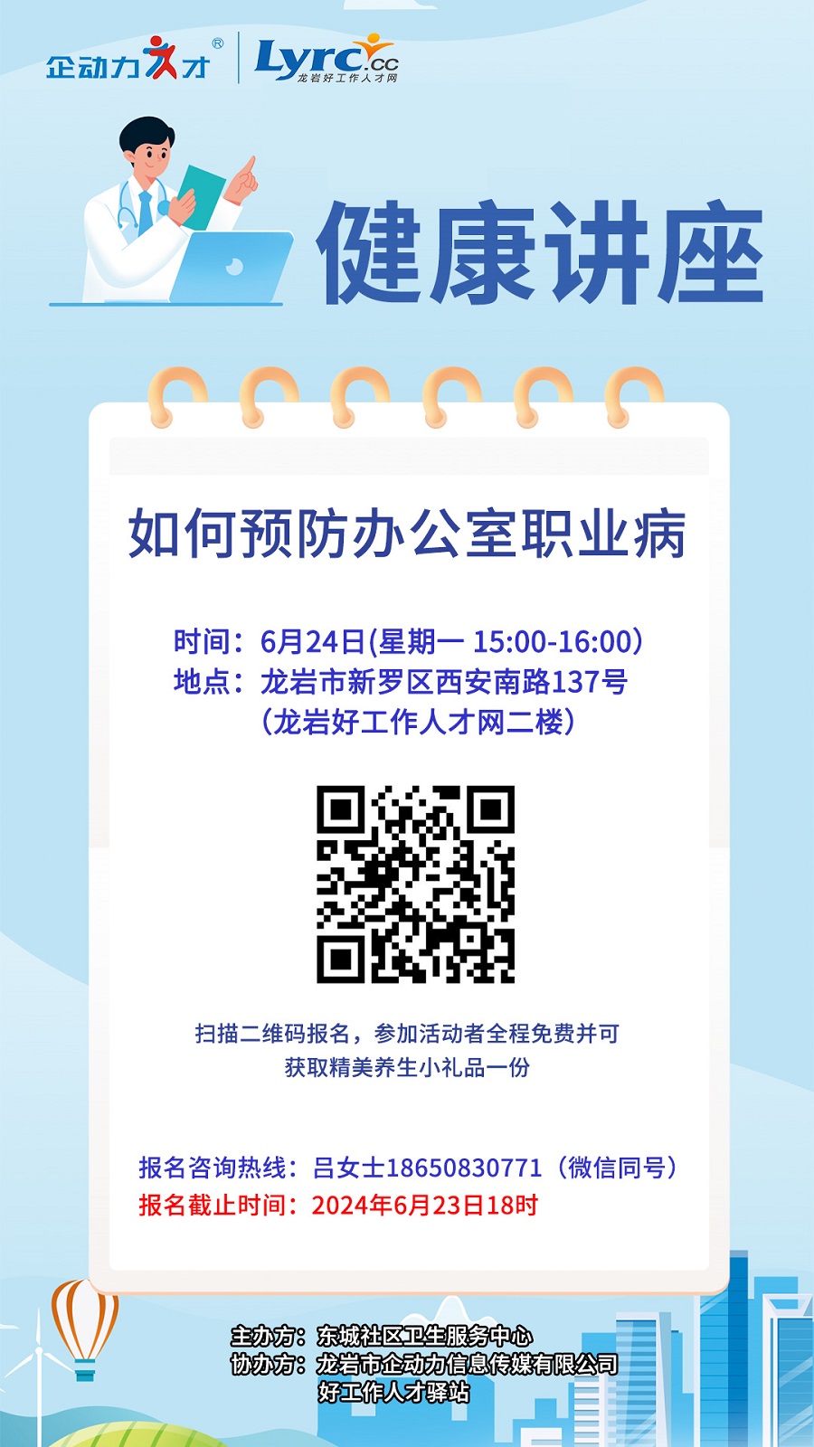 鑒于當(dāng)前辦公室員工普遍面臨各種職業(yè)健康問題,如視力疲勞、頸椎病、腰椎勞損等,為了提高辦公室職場(chǎng)人員的健康意識(shí),掌握正確的健康保障方法,從而提高工作和生活質(zhì)量,故擬計(jì)劃于6月24日在龍巖好工作人才網(wǎng)二樓開展《如何預(yù)防辦公室職業(yè)病》的健康知識(shí)講座。