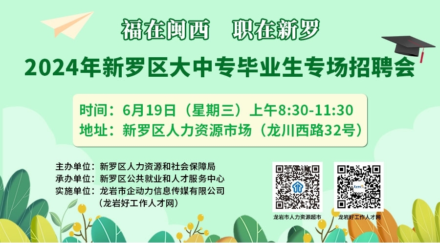 • 發(fā)布時(shí)間:2024/6/20 11:04:37  |  來(lái)源:龍巖好工作人才網(wǎng)  |  已瀏覽 人次