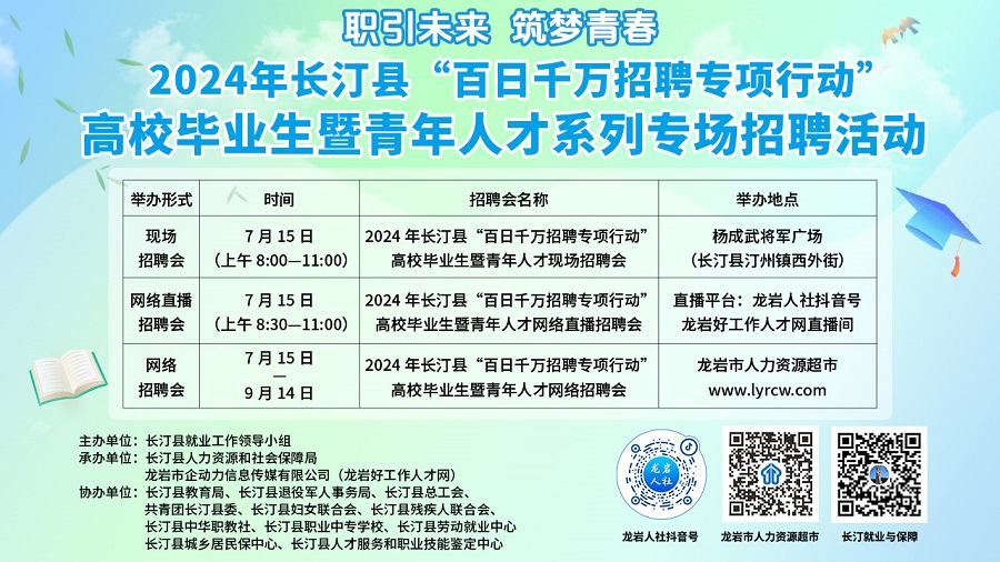• 2024年長汀縣“百日千萬招聘專項(xiàng)行動”高校畢業(yè)生暨青年人才專場招聘會!職引未來 筑夢青春!
