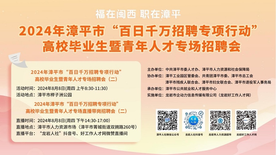 【8月8日】 “福在閩西 職在漳平”2024年漳平市“百日千萬招聘專項(xiàng)行動(dòng)”高校畢業(yè)生暨青年人才專場系列招聘會(huì)(二)