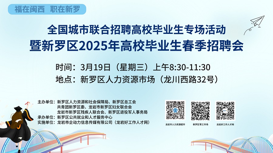 - 【3月19日】全國城市聯合招聘高校畢業(yè)生專場活動暨新羅區(qū)2025年高校畢業(yè)生春季招聘會