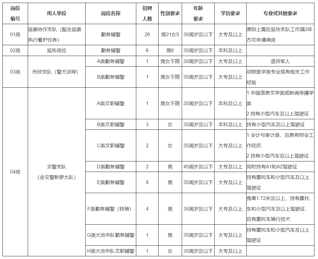 本次計劃招聘輔警56名,具體招聘崗位及要求詳見招聘崗位表。