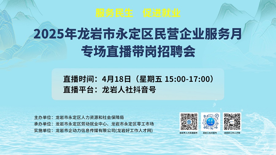 。ㄒ唬﹨䥺挝恍柙敿毺顚憽“服務民生 促進就業(yè)”2025年龍巖市永定區(qū)民營企業(yè)服務月專場直播帶崗招聘會報名表》,并于4月16日前發(fā)送至龍巖好工作人才網郵箱service@lyrc.cc或區(qū)就業(yè)中心郵箱ydldjy999@163.com,方便統(tǒng)一制作宣傳背景海報。