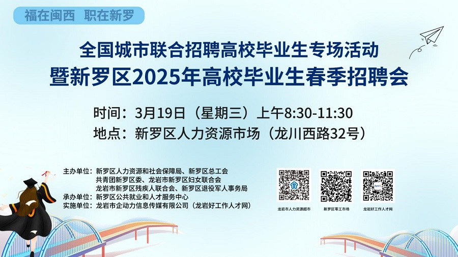 此次招聘會是由新羅區(qū)人力資源和社會保障局、新羅區(qū)總工會、共青團(tuán)新羅區(qū)委、龍巖市新羅區(qū)婦女聯(lián)合會、龍巖市新羅區(qū)殘疾人聯(lián)合會、新羅區(qū)退役軍人事務(wù)局主辦;新羅區(qū)公共就業(yè)和人才服務(wù)中心承辦 ;龍巖市企動力信息傳媒有限公司(龍巖好工作人才網(wǎng))實施,以“福在閩西 職在新羅”為主題。