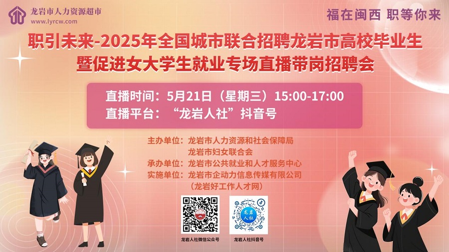 深入貫徹落實黨中央、國務院關于做好就業(yè)工作的決策部署,充分提升女性就業(yè)質量,實現(xiàn)各類企業(yè)與女性人才互贏,全方位多角度支持女性勞動者求職及職業(yè)發(fā)展提升,龍巖市人力資源和社會保障局、龍巖市婦女聯(lián)合會于2025年5月21日下午,在龍巖市人力資源超市成功舉辦了職引未來—2025年全國城市聯(lián)合招聘龍巖市高校畢業(yè)生暨促進女大學生就業(yè)專場直播帶崗招聘會。