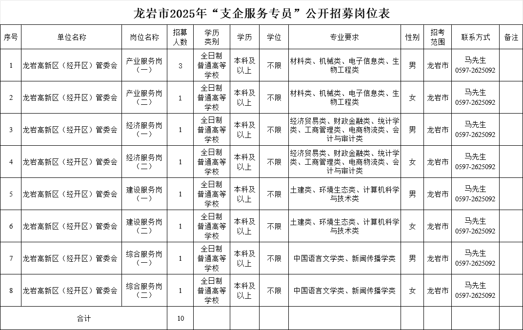 本次計劃招募龍巖市“支企服務(wù)專員”10名,派駐到龍巖高新區(qū)(經(jīng)開區(qū))從事服務(wù)企業(yè)工作,服務(wù)期限2年。具體招募崗位及要求詳見《龍巖市2025年“支企服務(wù)專員”公開招募崗位表》(附件1)。報考人員可登錄龍巖市人力資源和社會保障局官網(wǎng)(http://rsj.longyan.gov.cn/)或龍巖人事考試網(wǎng)(http://syzp.lyrszx.cn/syzp/indexpage)查閱。
