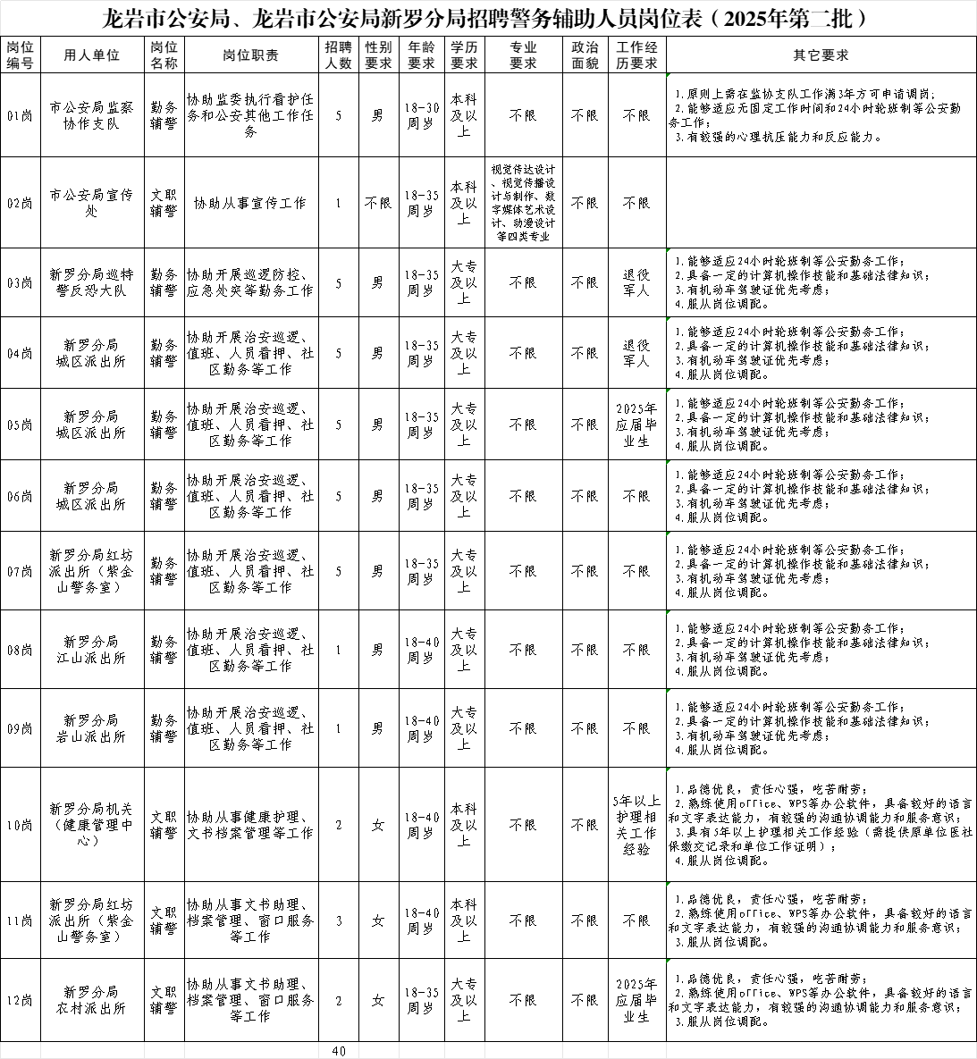 9.從龍巖市公安機(jī)關(guān)輔警崗位中辭職,自批準(zhǔn)辭職之日起不滿一年的不得報(bào)考01、02崗;從新羅分局輔警隊(duì)伍離職的不得報(bào)考03至12崗;