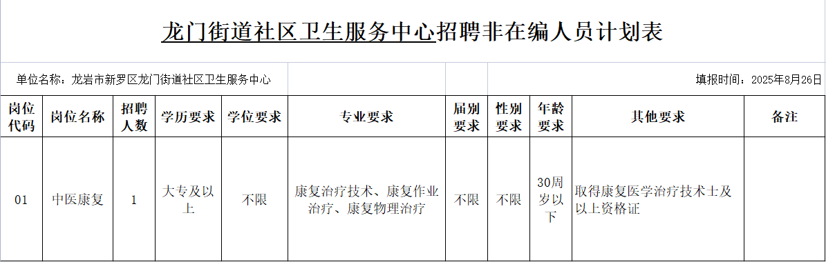龍門街道社區(qū)衛(wèi)生服務(wù)中心招聘編外人員崗位及要求
