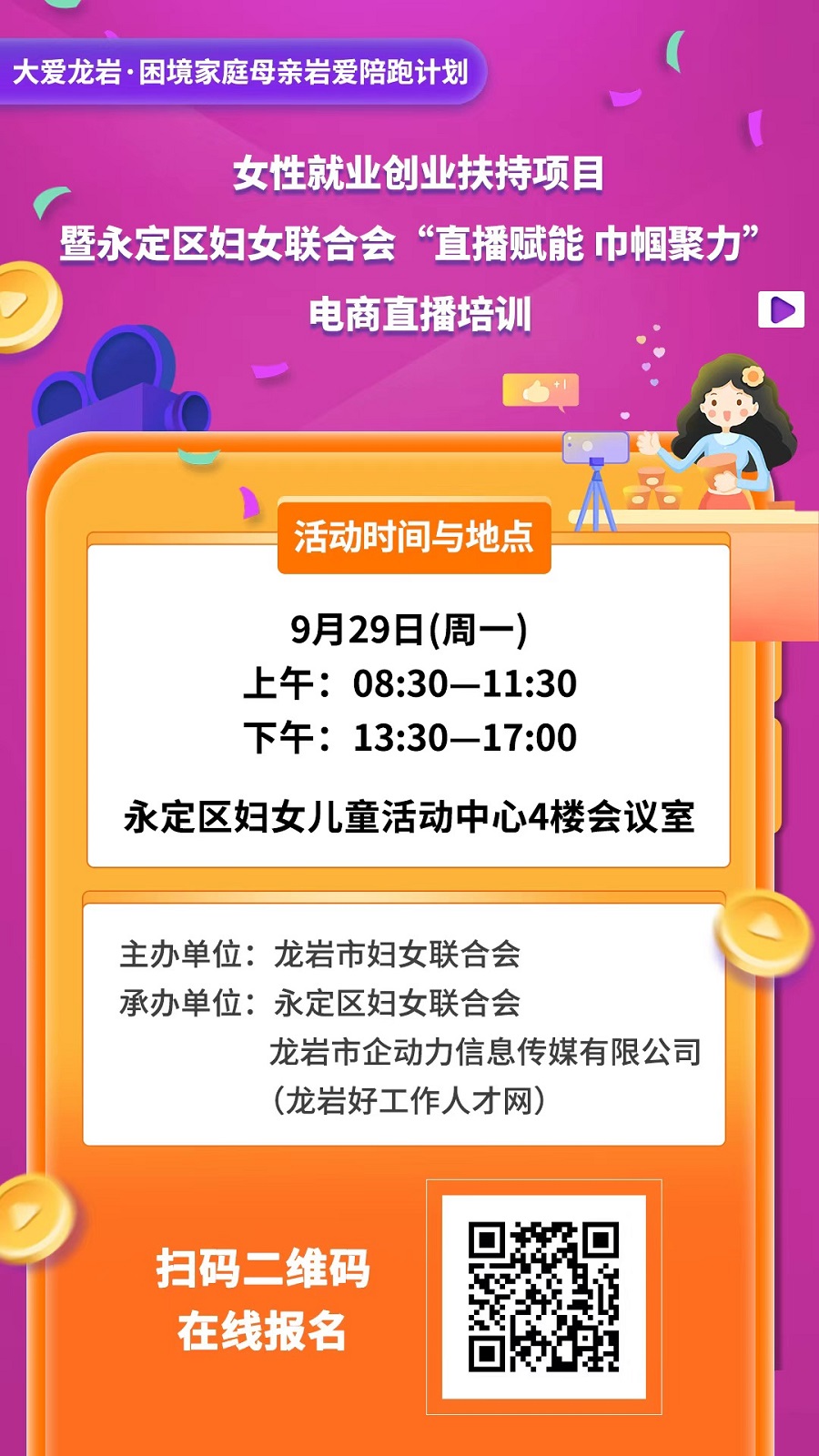 永定區(qū)有電商直播創(chuàng)業(yè)意愿的城鄉(xiāng)女性;待業(yè)、下崗女性及全職媽媽群體;有意拓展線上渠道的女性個體工商戶等女性群體。
