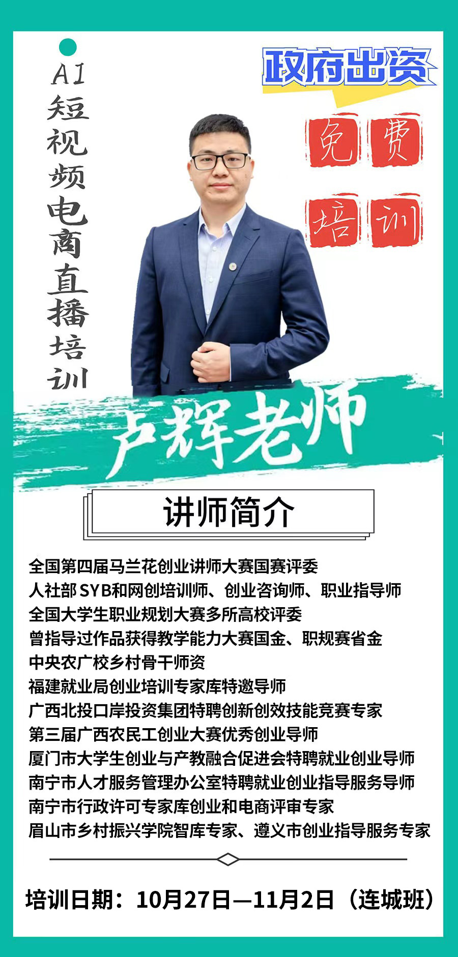 【免費(fèi)培訓(xùn)】龍巖電商AI短視頻直播培訓(xùn)9月23日開(kāi)班啦!人社部部級(jí)培訓(xùn)師來(lái)巖授課,名額有限速搶!
