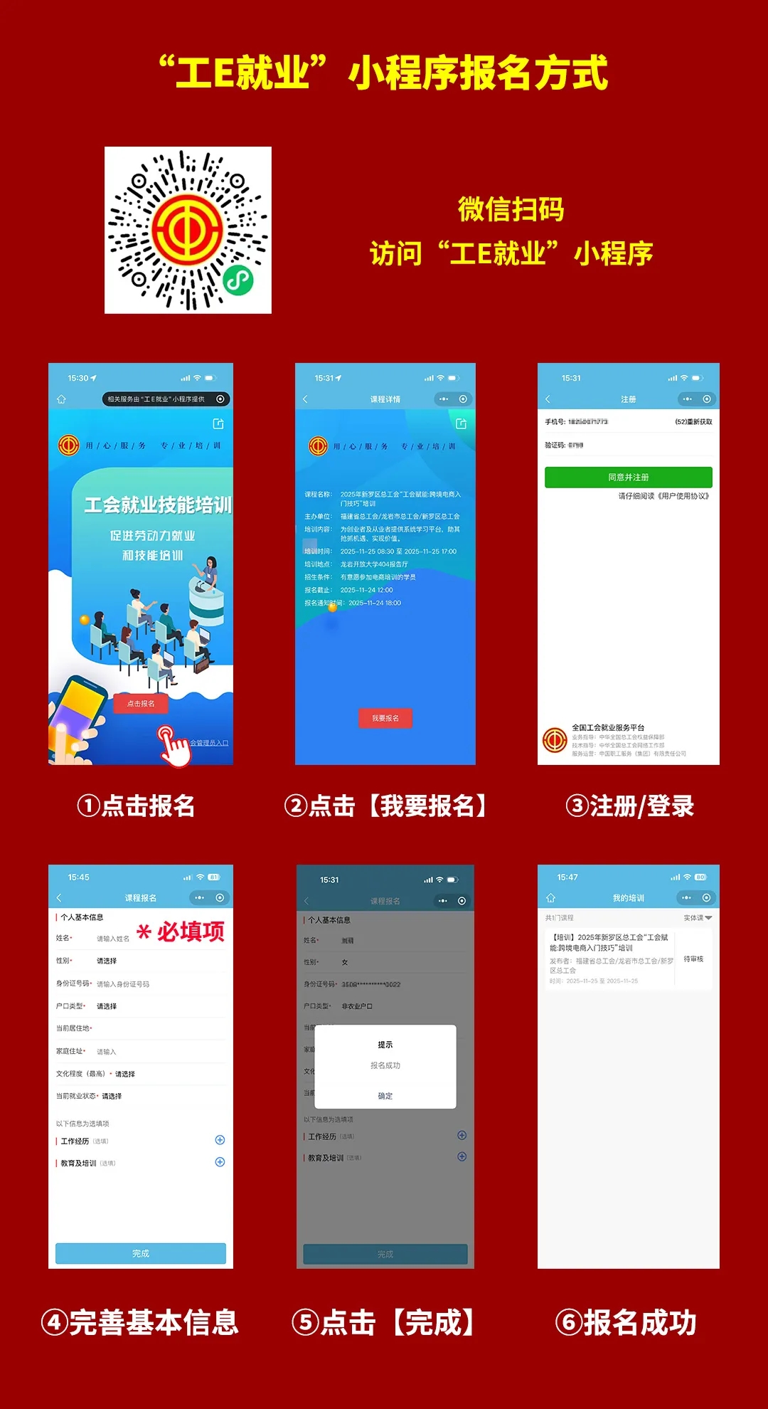 1.掃描二維碼進(jìn)入“工E就業(yè)”進(jìn)行報(bào)名。輸入手機(jī)號(hào)碼進(jìn)行驗(yàn)證,填寫(xiě)課程報(bào)名信息,完成報(bào)名。