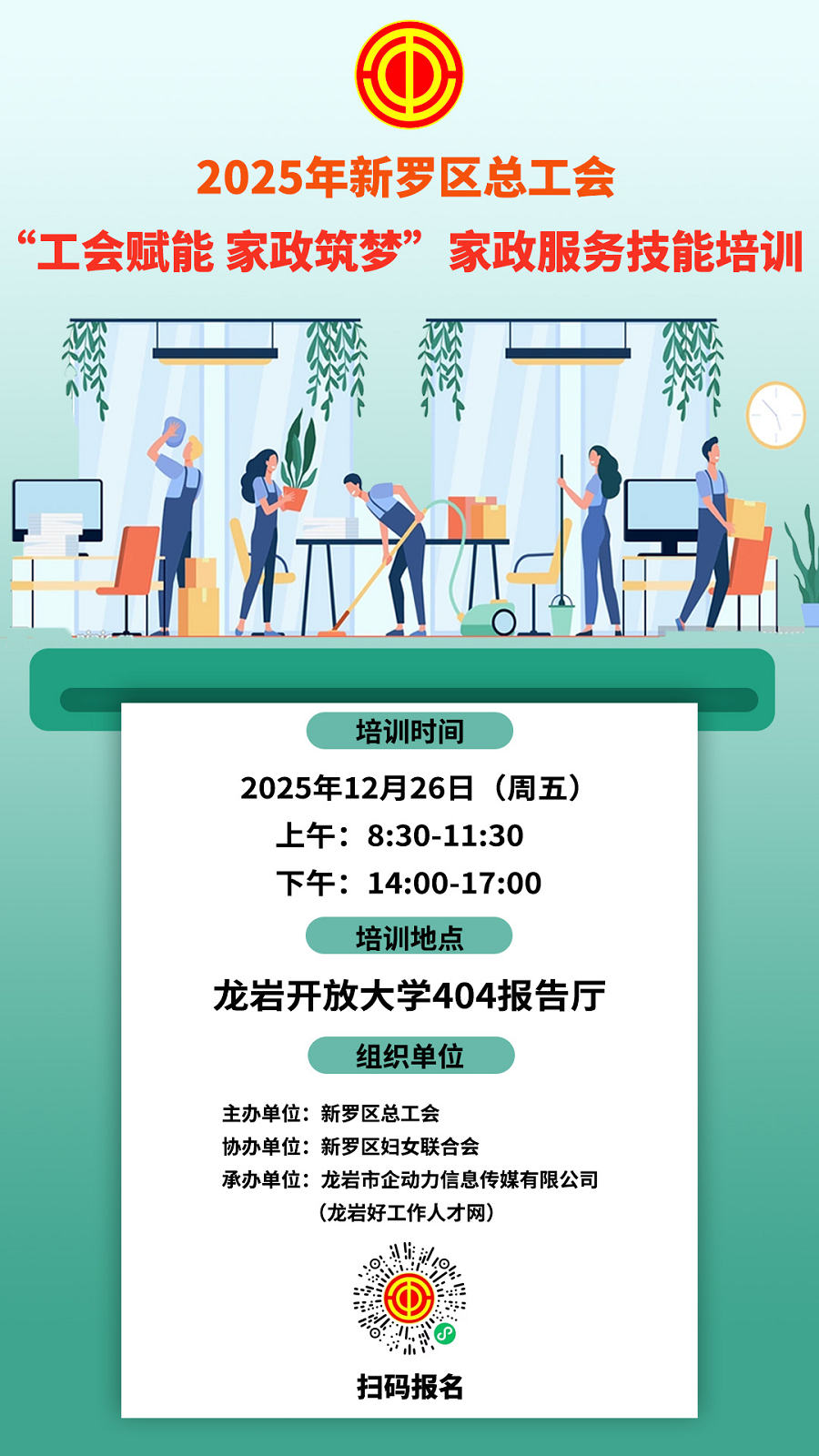 新羅區(qū)待業(yè)青年、轉(zhuǎn)崗職工、農(nóng)村轉(zhuǎn)移就業(yè)勞動者、城鄉(xiāng)富余勞動力,在崗家政從業(yè)人員,需靈活就業(yè)的女職工及有增收、技能提升與就業(yè)訴求的各類勞動者。