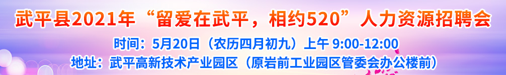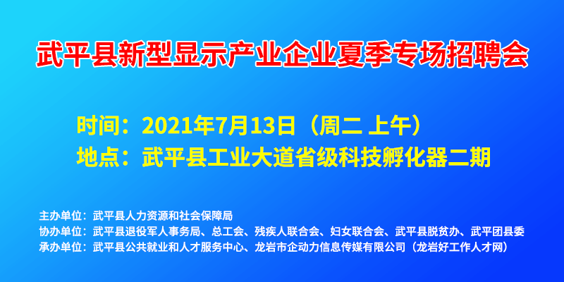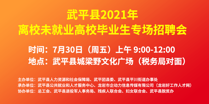 舉辦單位:武平縣人力資源和社會(huì)保障局、共青團(tuán)武平縣委、武平縣平川街道辦事處、武平縣城廂鎮(zhèn)人民政府